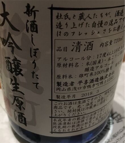 にほんブログ村 ↑d(^_^o) 岡山県の平喜酒造さんの限定酒です。 元々は静岡の平喜さんが発祥だったかと。 あちらの酒づくりも最近復活したようなので、いつか飲んでみたいなあ。 酒米は雄町、精米歩合は35%。 飲。 (・ω・)!!‼︎ デリシャスリンゴ、甘み、…